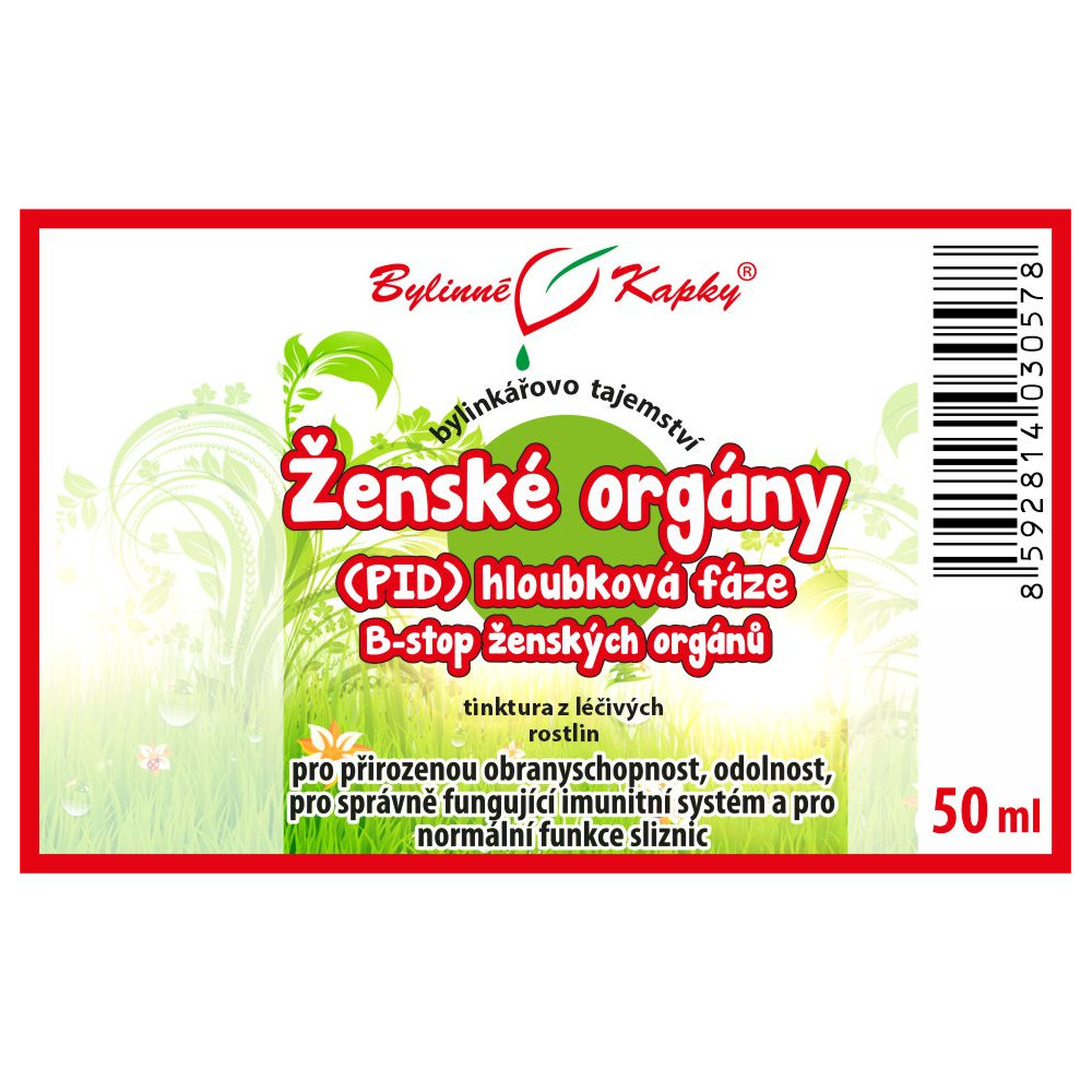 Ženské orgány (PID) - hloubková fáze - B-stop ženských orgánů (bylinná tinktura - bylinné kapky z řady Bylinkářovo tajemství). Pochva, děložní čípek, děloha, děložní sliznice, vejcovody, vaječníky, pánevní pobřišnice, okolní vazivové tkáně dělohy, Douglasův prostor, pánevní lymfatický systém, pánevní cévní řečiště. Přírodní bylinný celkový (komplexní) extrakt z léčivých rostlin pro normální funkce imunitního systému, přirozenou obranyschopnost, normální funkce sliznic a pročištění. Směs navržená pro časově omezené kúry zaměřené na hlubší a dlouhodobé procesy v oblasti ženských pohlavních orgánů.