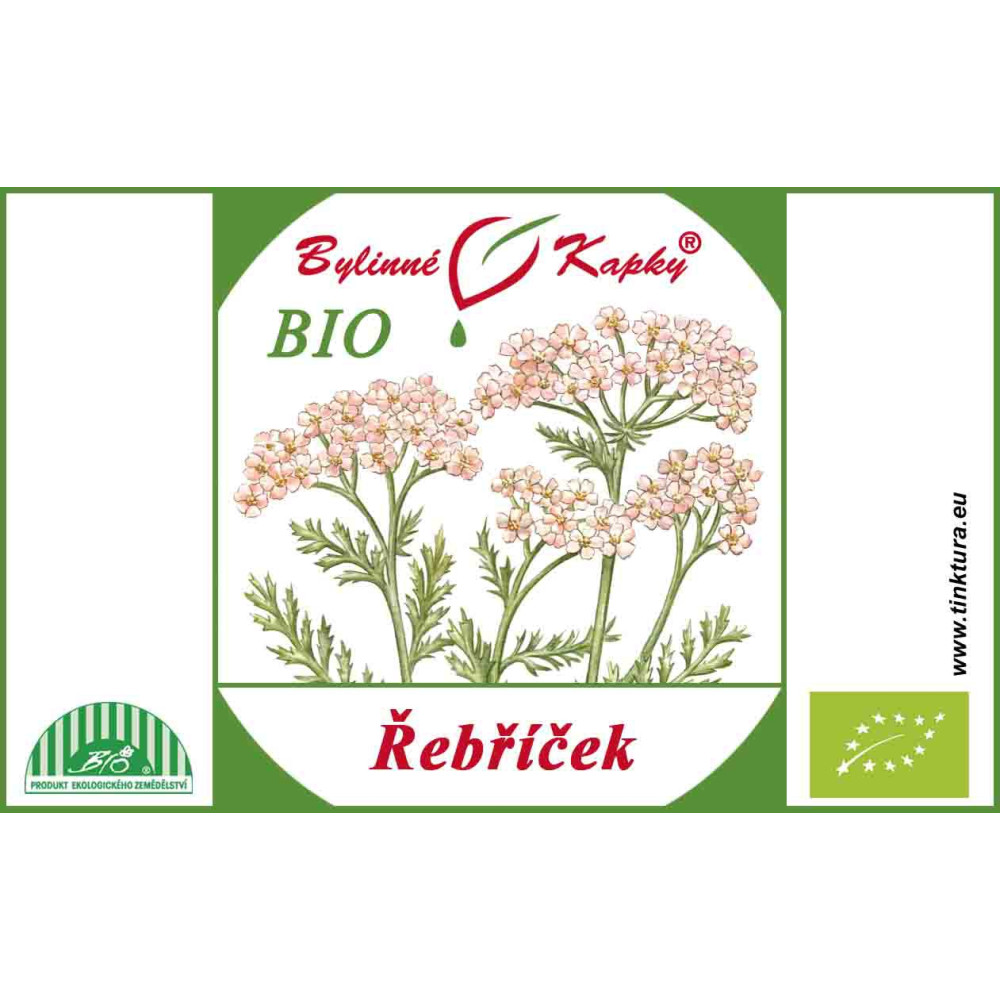 Řebříček BIO (bylinná tinktura - bylinné kapky - tinktury BIO). Přírodní bylinný extrakt z natě léčivé rostliny řebříčku obecného pro normální trávení a menstruační komfort. Kód kontrolní organizace: CZ-BIO-002. Tinctura Achilleae herba. Tincture Yarrow herb. T4/K3