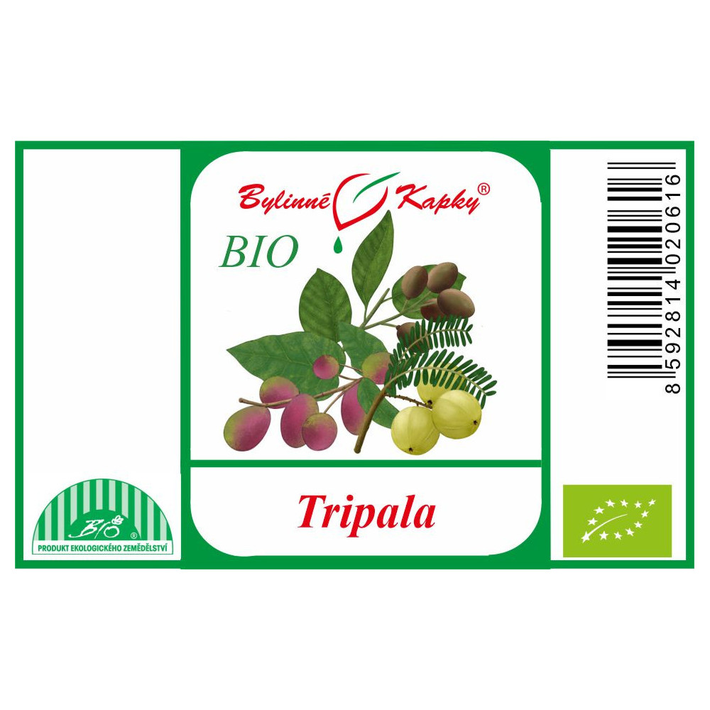 Tripala (Triphala) BIO (bylinná tinktura - bylinné kapky - tinktury BIO). Přírodní bylinný extrakt z léčivých rostlin dle tradičního ájurvédského receptu pro normální trávení, vylučování a střevní pohyb. Na pročištění střev (detoxikace) a zlepšení metabolismu. Výživa tkání. Kód kontrolní organizace: CZ-BIO-002.