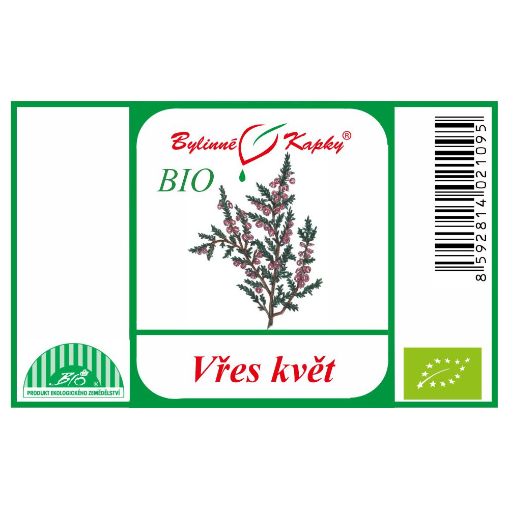 Vřes květ BIO (bylinná tinktura - bylinné kapky - tinktury BIO). Přírodní bylinný celkový (komplexní) extrakt z květu léčivé rostliny vřesu obecného pro normální funkce močových cest, pro hlubší spánek, dobrou náladu a duševní rovnováhu. Vřes obecný (Calluna vulgaris). Kód kontrolní organizace: CZ-BIO-002. Tinctura Callunae flos. Tincture Heather flower.