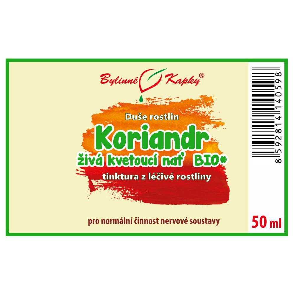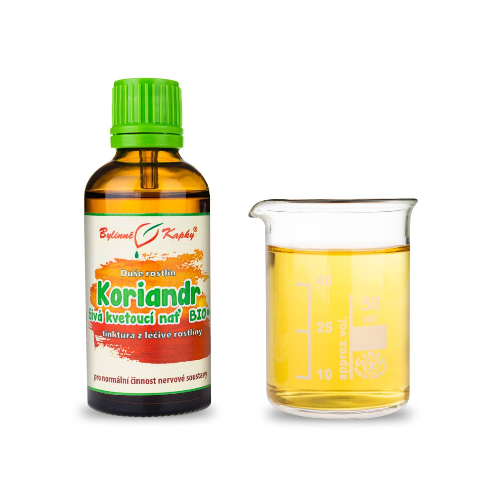 * Tinktura z živé kvetoucí natě koriandru setého v kvalitě BIO. Zpracováno bezprostředně po sklizni. Při výrobě byl použit konvenční melasový líh, v naší nabídce je i tinktura vyrobená z ovocné pálenky v kvalitě BIO.