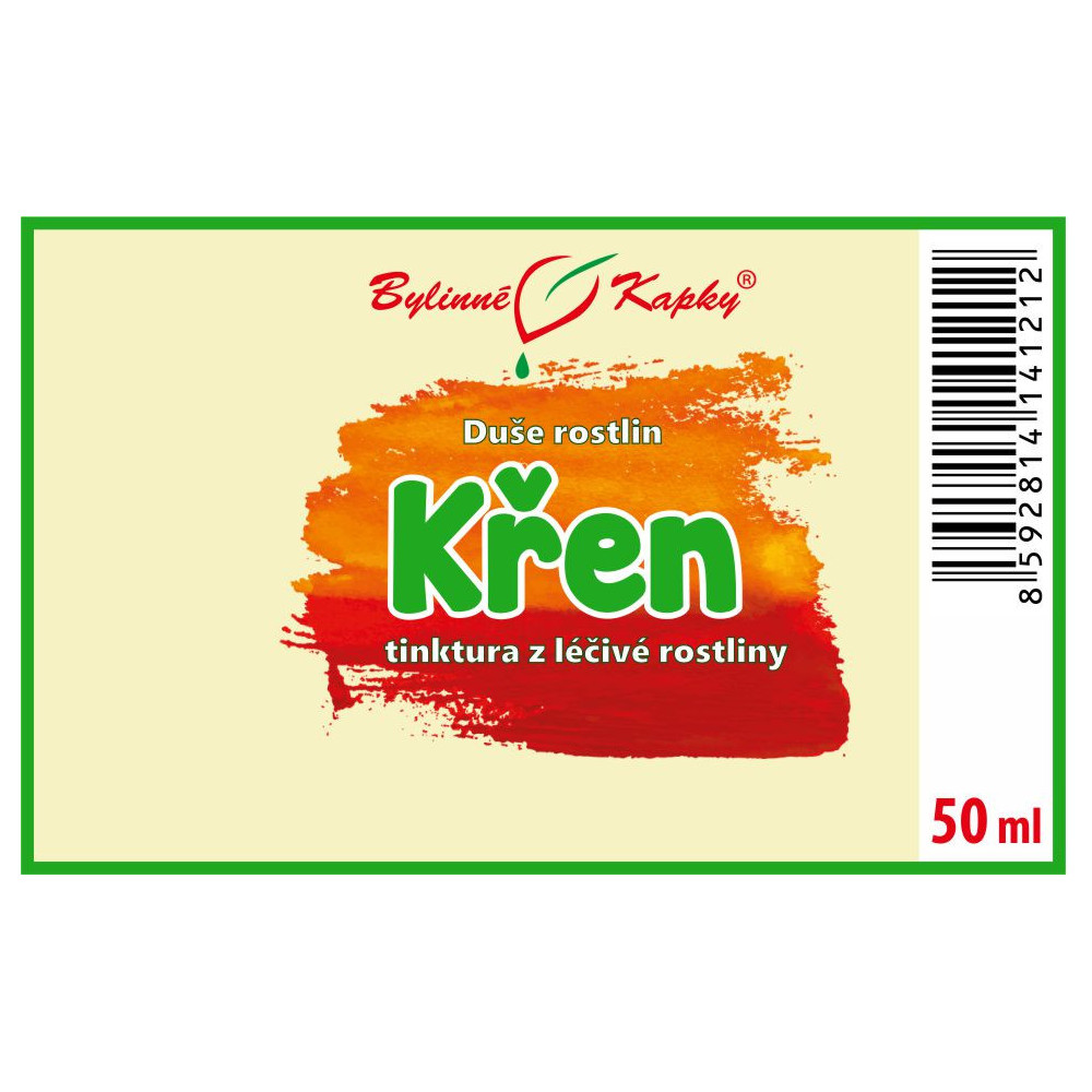 Křen (bylinná tinktura - kapky Duše rostlin). Přírodní bylinný celkový (komplexní) extrakt z kořene léčivé rostliny křenu selského. Křen selský (Armoracia rusticana). Tinctura Armoraciae radix. Tincture Horseradish root.