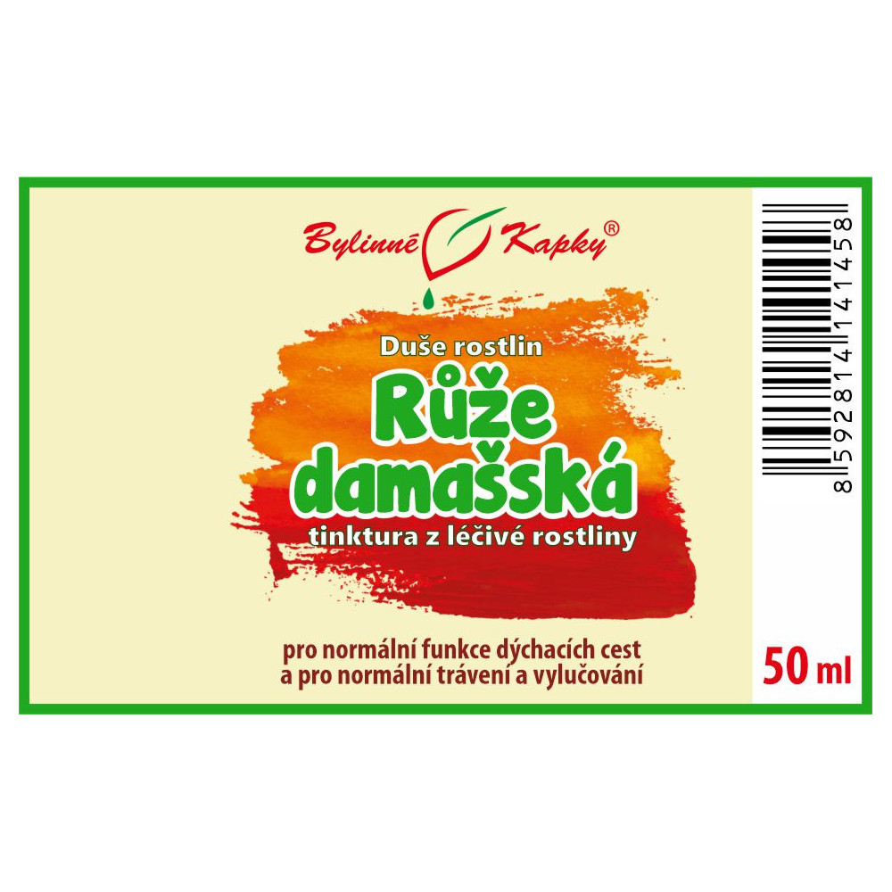 Růže damašská (tinktura z živé léčivé rostliny - kapky Duše rostlin). Přírodní bylinný celkový (komplexní) extrakt z květu léčivé rostliny růže damašské pro normální funkce dýchacích cest a pro normální trávení a vylučování. Obsah živé rostliny: 67%. Růže damašská (Rosa damascena).