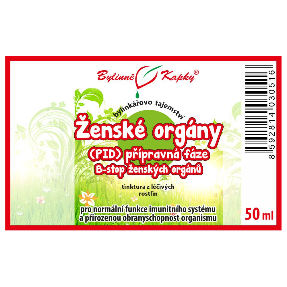 Ženské orgány (PID) (vaječníky, vajíčkovody, maternica, pobrušnice - B-stop ženských orgánov) (bylinná tinktúra - bylinné kvapky z radu Bylinkárovo tajomstvo). Prírodný bylinný celkový (komplexný) extrakt z liečivých rastlín pre normálne funkcie imunitného systému a prirodzenú obranyschopnosť.