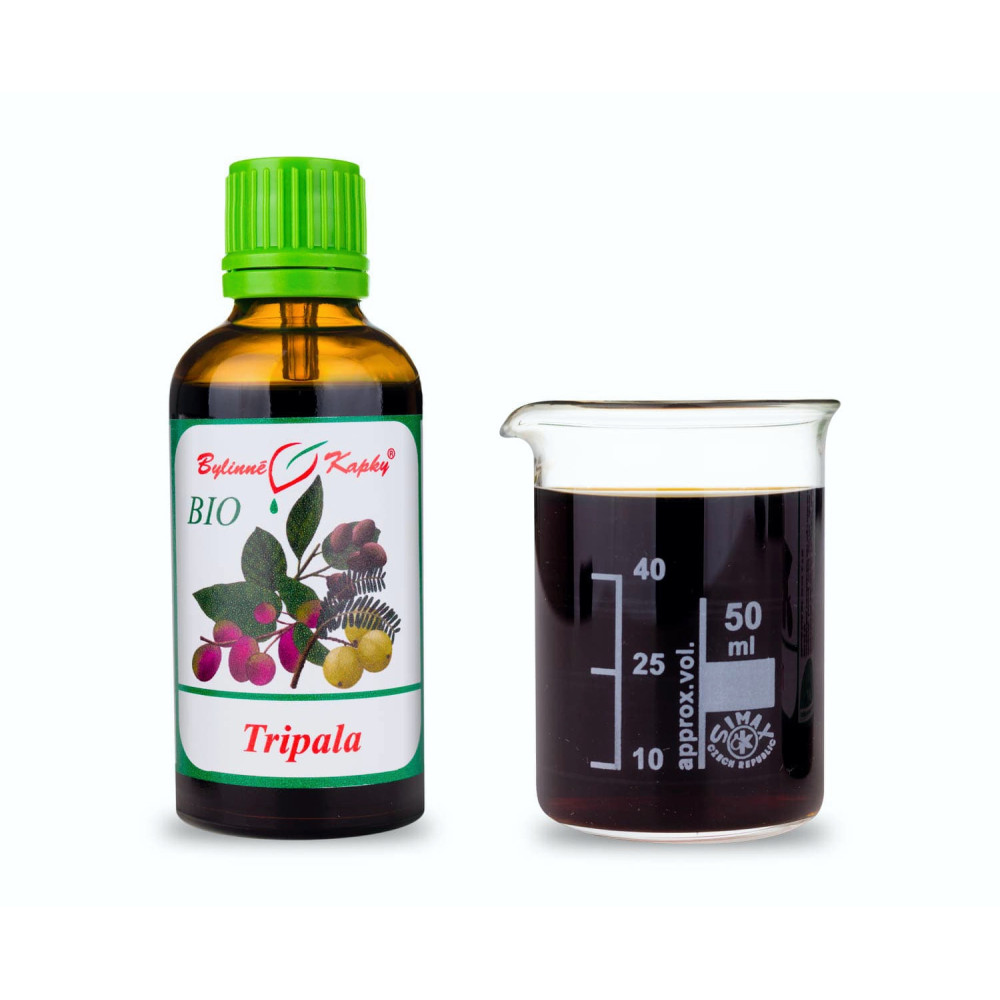 Tripala (Triphala) BIO (bylinná tinktúra - bylinné kvapky - tinktúry BIO). Prírodný bylinný extrakt z liečivých rastlín podľa tradičného ajurvédskeho receptu pre normálne trávenie, vylučovanie a črevný pohyb. Na prečistenie čriev (detoxikácia) a zlepšenie metabolizmu. Výživa tkanív. Kód kontrolnej organizácie: CZ-BIO-002.